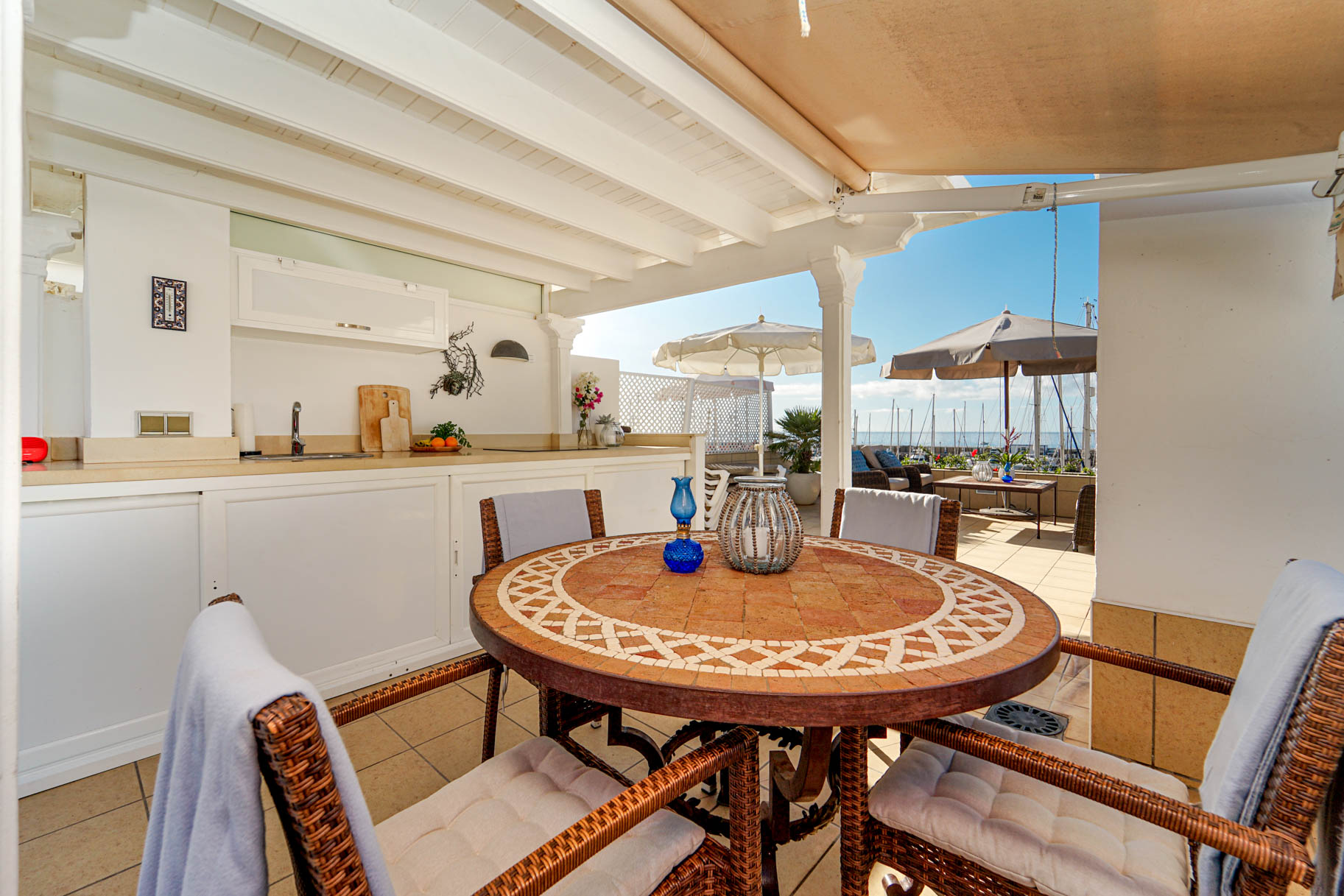 La terraza ofrece una experiencia agradable y hermosa con un sol perfecto desde la mañana hasta la noche. La vista del puerto deportivo, el paseo marítimo y el océano Atlántico es fascinante. La terraza cuenta con excelentes calidades y todo el equipamiento necesario para pasar la mayor parte del día.